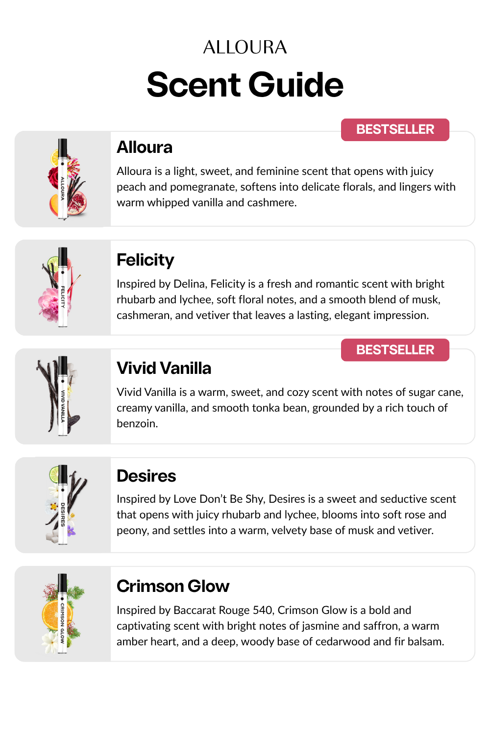 Alloura: Alloura is a light, sweet, and feminine scent that opens with juicy peach and pomegranate, softens into delicate florals, and lingers with warm whipped vanilla and cashmere.